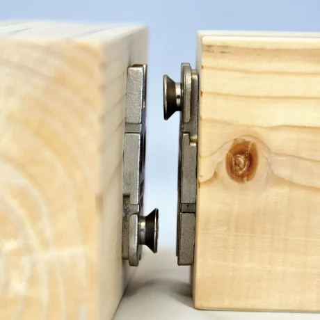 The system consists of two identical stainless steel connector plates that interlock in a dovetail-style connection. One plate is installed into a milled recess, while the mating plate is surface-mounted. During assembly, the plates slide together and lock securely, creating a strong, concealed joint. An optional stainless steel locking bar can be installed to secure the connection while still allowing future disassembly if required.