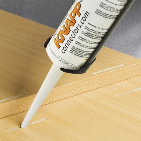 Installation: Cut a #20 slot with a biscuit joiner, add KNAPP-Adhesive PU+, and insert the connector