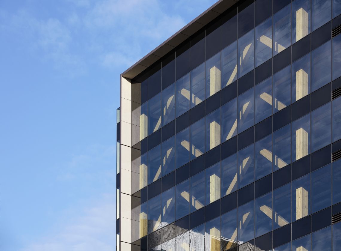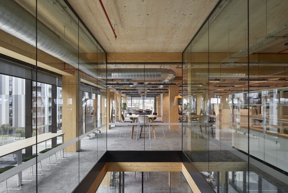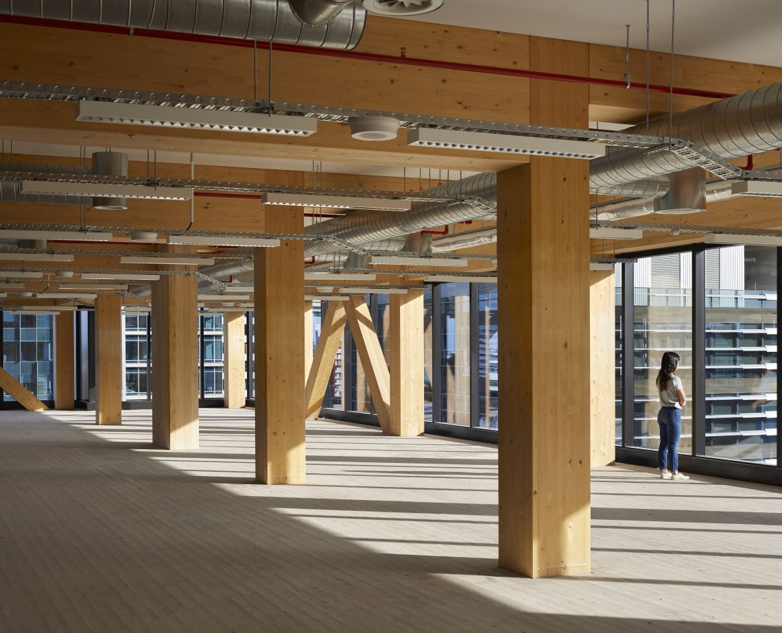 Mass timber construction: The office tower used timber frame construction with glulam beams and CLT floor panels, delivering durability and design flexibility.