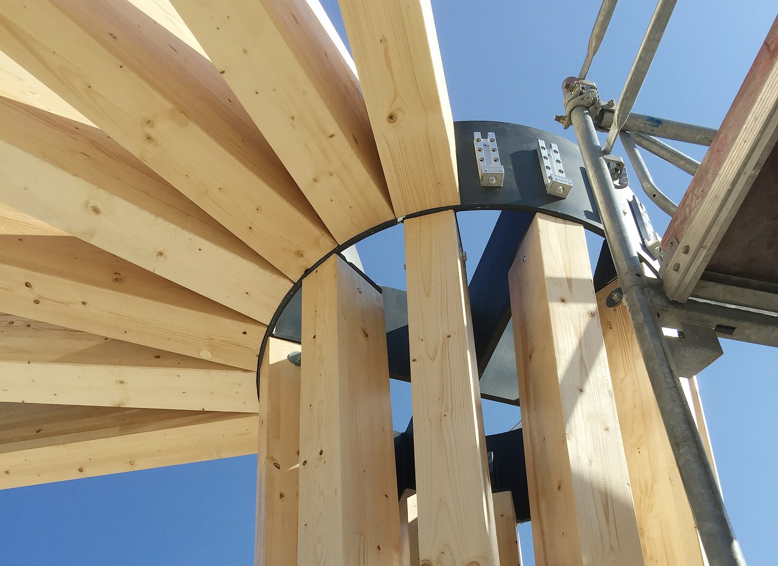 Connector technology: MEGANT connectors enabled secure and invisible load-bearing joints for the curved timber structure.