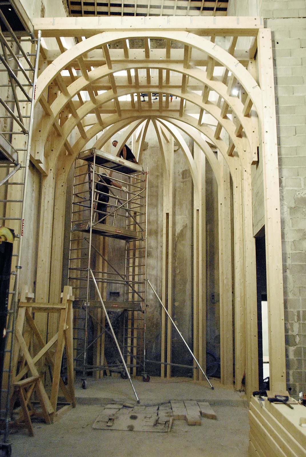 Construction method: Prefabricated timber elements assembled on-site within existing masonry.