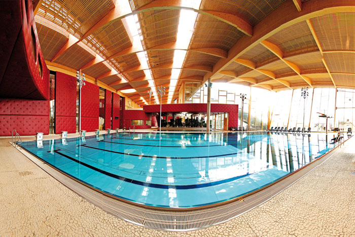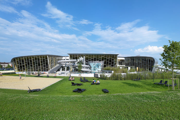 Completed in 2009, Les Thermes is a leisure and swimming complex serving Luxembourg and neighboring regions of Germany, France, and Belgium. With a gross building volume of 60,560 m³ and a floor area of 10,930 m², it is one of the country’s most significant public timber structures.