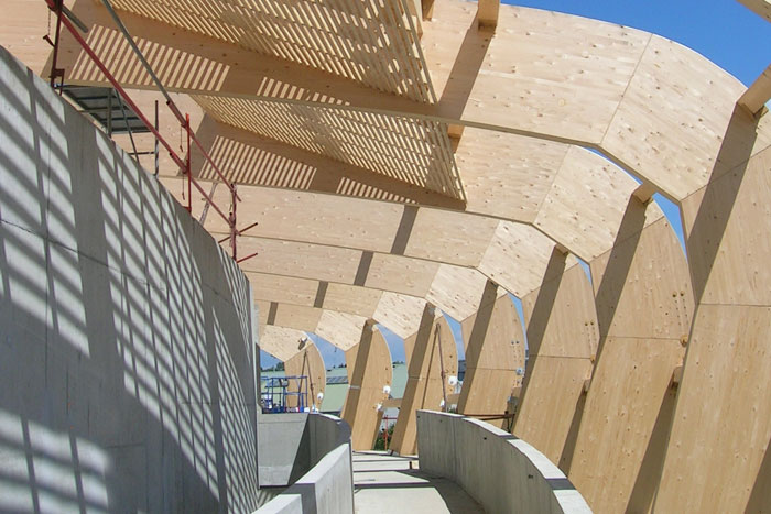 Construction method: Concrete base with large-span timber roof trusses, glulam semi-frames, and glass façades.