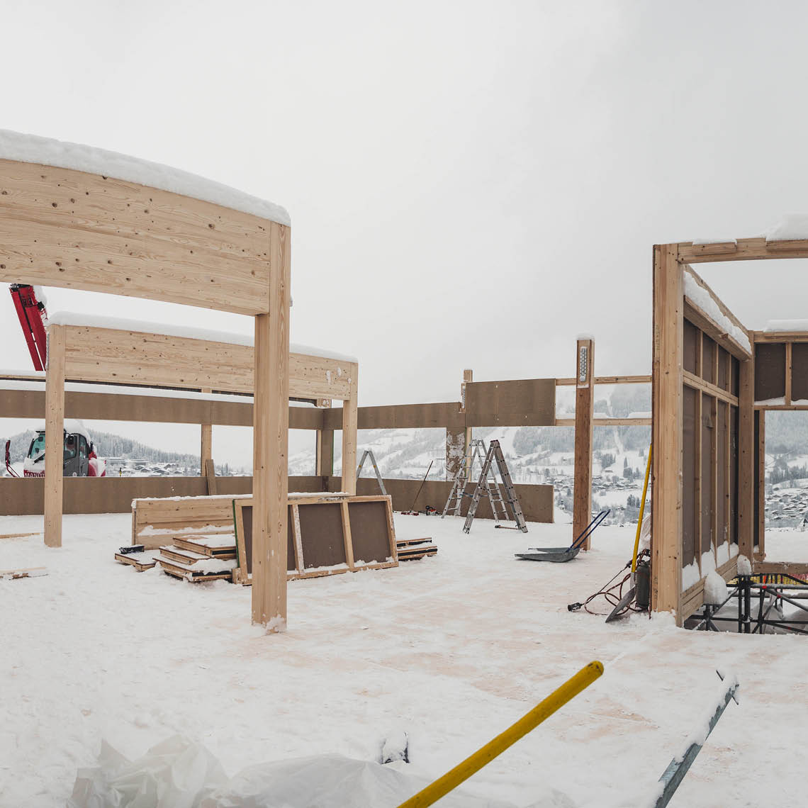 Construction method: Prefabricated timber modules assembled quickly in winter conditions.