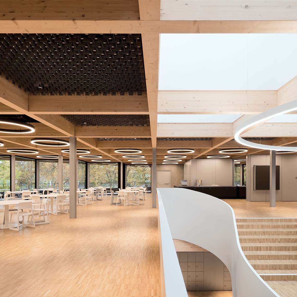 Completed in 2021, the Mensa Nord Darmstadt serves as the new refectory and auditorium for the North Vocational School in Darmstadt, Germany. The project is a showcase of laminated timber construction combined with architectural transparency and warmth.