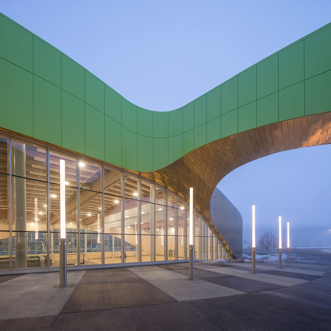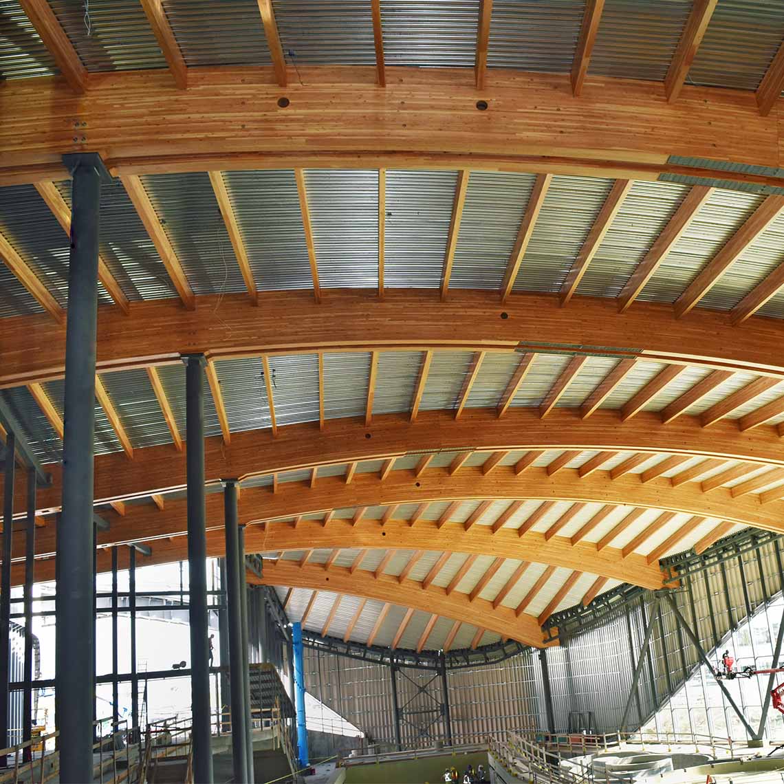 Opened in 2016, the Shane Homes YMCA at Rocky Ridge in Calgary is one of the largest mass timber recreational facilities in North America. The center covers 26,500 m² and houses a wide range of community amenities, including pools, gyms, theaters, ice rinks, and multipurpose spaces.
