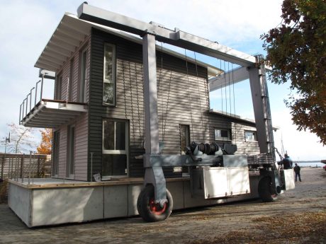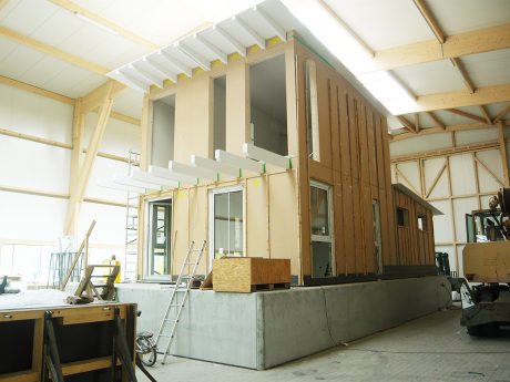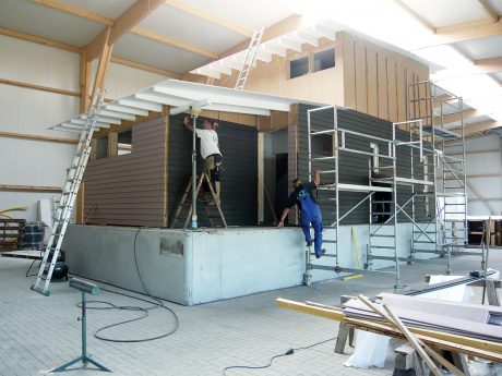 Prefabricated timber frame construction with wall modules assembled in the marina’s own hall.