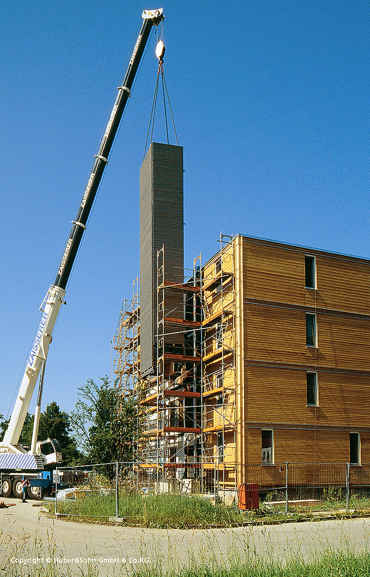 Fast construction: four storeys were erected in just four days. Each day, a full level was completed using prefabricated wall and floor elements with windows and façade panels already installed.