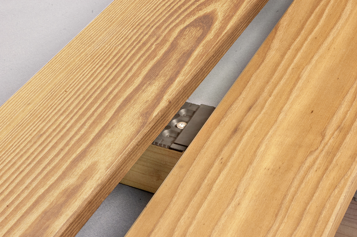 Each set includes a pair of interlocking connectors and stainless steel screws. The connectors sit between adjacent deck boards on the joist, creating a controlled gap that provides drainage, rear ventilation, and room for the natural shrinking and swelling of wood. The result is a cleaner deck surface and better wood protection.