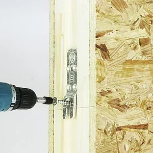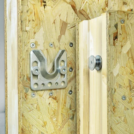 The set consists of two identical brackets made out of blue-galvanized steel. For better insulation, you can install rubber gaskets on either side of the wall connector before your prefab wall is assembled. When sliding the wall panels together, the brackets hook into each other in a dovetail-like manner and tighten up the joint. With this in mind, your wall panels can be pre-manufactured to a large degree in a superior and advanced fashion and then connected on-site with no screwing or nailing needed.