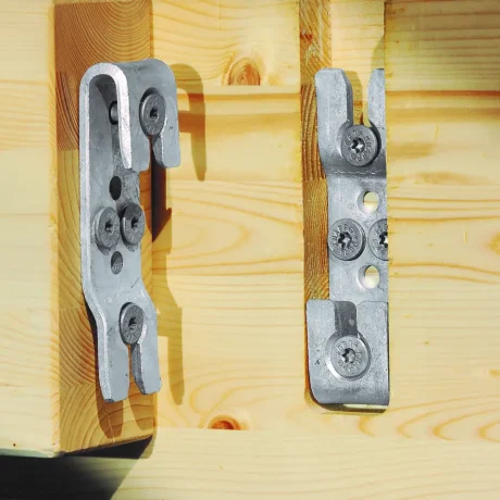 The GIGANT connecting system consists of two identical connector brackets made of steel. The brackets are recessed and screwed onto the timber components. You can join your timber components by hooking the two brackets into each other in a dovetail-like manner. You can use the GIGANT for timber structures, such as, canopies, pergolas, sunrooms, timber homes, and even engineered timber structures. The GIGANT connectors are non-visible, self-tightening, and adjustable, with no additional screwing or nailing required to assemble the timber structure on site. You can install an optional locking clip to latch the connector against the slide-in direction. The GIGANT is available in three sizes, 120/40, 150/40 and 180/40.