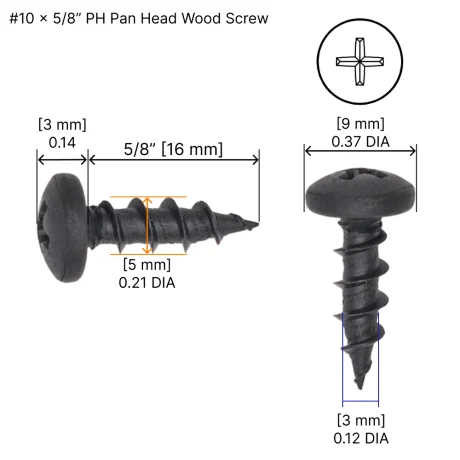 #10 Pan Head Wood Screw with Phillips drive, made from black phosphate-coated steel for strength and corrosion resistance. The pan head sits above the work surface, providing a wider bearing area for secure fastening without countersinking.
