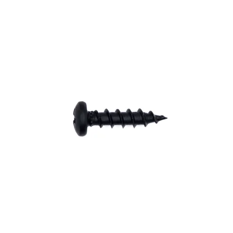 #6 Pan Head Wood Screw with Phillips drive, made from black phosphate-coated steel for corrosion resistance and durability. The pan head provides a smooth, rounded profile that sits above the work surface rather than countersinking into it, distributing the fastening load across a wider area and reducing the risk of pull-through in thin or soft materials.