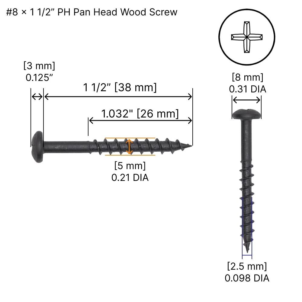 #8 Pan Head Wood Screw with Phillips drive, made from black phosphate-coated steel for strength and corrosion resistance. The pan head sits above the work surface, providing a wider bearing area for secure fastening without countersinking.