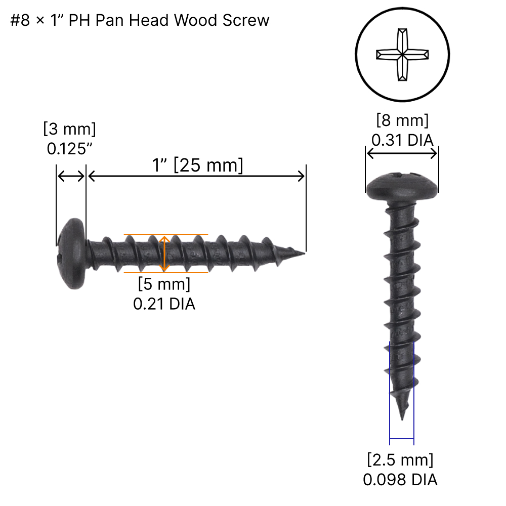 #8 Pan Head Wood Screw with Phillips drive, made from black phosphate-coated steel for strength and corrosion resistance. The pan head sits above the work surface, providing a wider bearing area for secure fastening without countersinking.