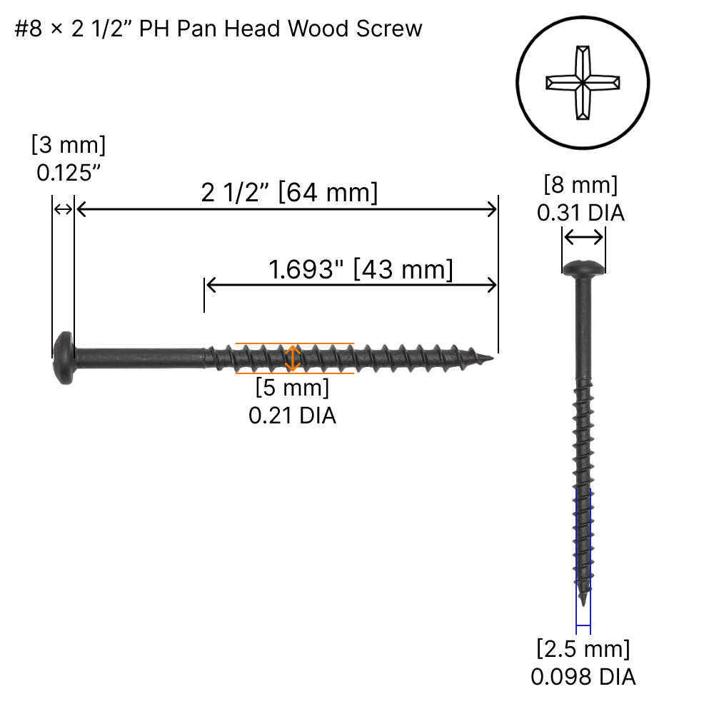 #8 Pan Head Wood Screw with Phillips drive, made from black phosphate-coated steel for strength and corrosion resistance. The pan head sits above the work surface, providing a wider bearing area for secure fastening without countersinking.
